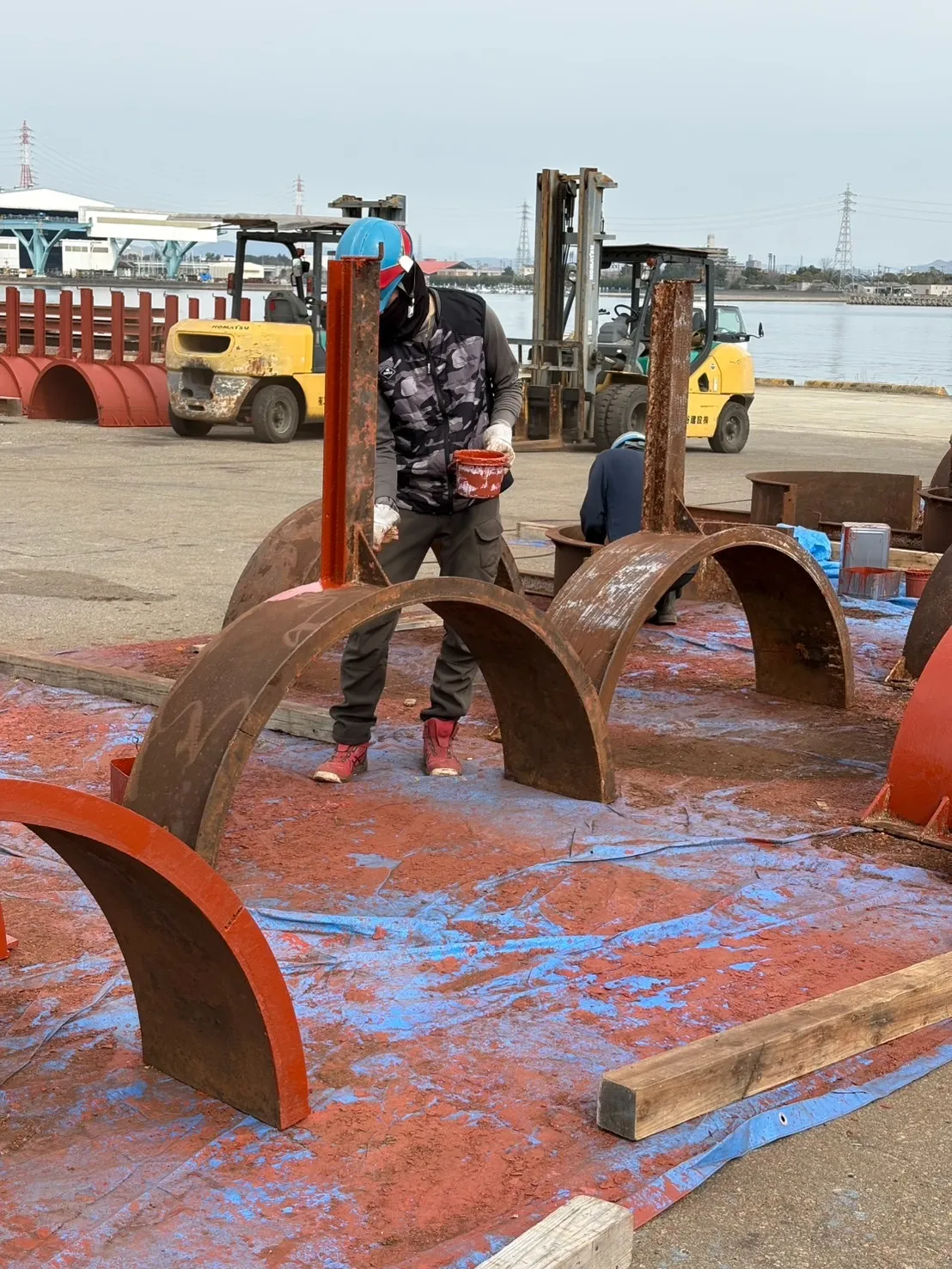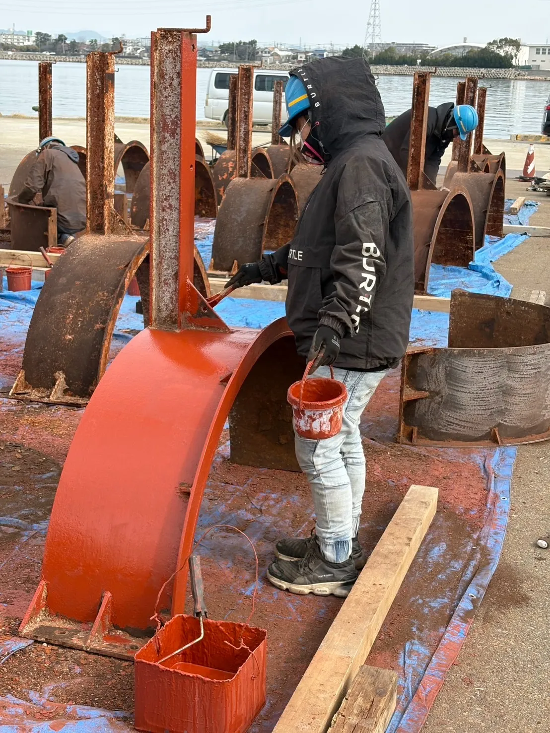 フジツボを削り取り、下塗り(さび止め)をする作業です